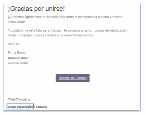 Es precisamente este email de bienvenida el que usaremos de ejemplo para mostrar cómo, cualquier comunicación por email enviada a los contactos, debería incluir en el pie de página enlace que permita anular la subscripción: