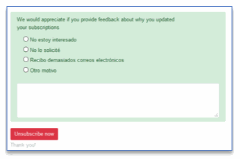 Si el receptor del email hace clic sobre ese enlace, es redirigido a una web que le permite anular la subscripción indicando el motivo de dicha anulación: