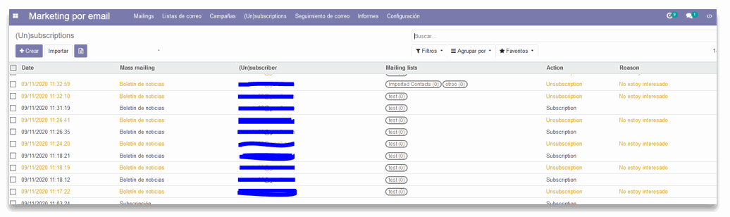 El módulo “base” de marketing por email de Odoo sólo permite realizar esta gestión de una forma muy básica. Sin embargo, existe otro módulo de la OCA (Odoo Communty Association) llamado mass_mailing_custom_unsubscribe que amplia considerablemente la gestión relativa a la blacklist: