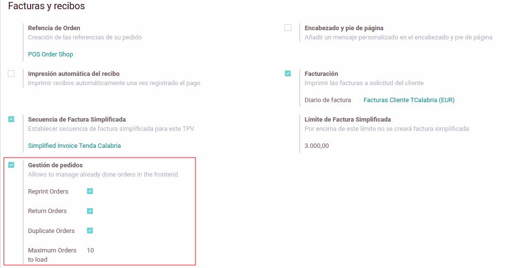 Antes de nada, debemos ir a la configuración de nuestro TPV para indicar que funcionalidades queremos de este módulo en nuestras pantallas. Para ello, entraremos en la aplicación de TPV y iremos a Configuración → Punto de Venta. Seleccionaremos el Punto de Venta en que queremos configurar esta opción, y en Facturas y recibos podremos ver la opción Gestión de pedidos.