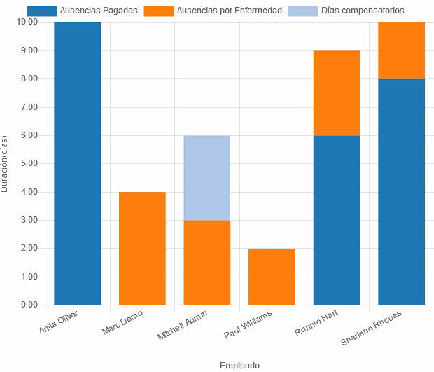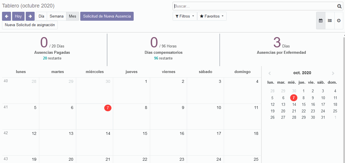 En la imagen anterior (Tablero de Mis Ausencias) puede verse cómo el usuario dispone de un contador en la parte superior que muestra el total de Ausencias Pagadas, Días Compensatorios y Ausencias por enfermedad (tipología establecida en la configuración de los diferentes tipos de ausencias que se definan para cada compañía).
