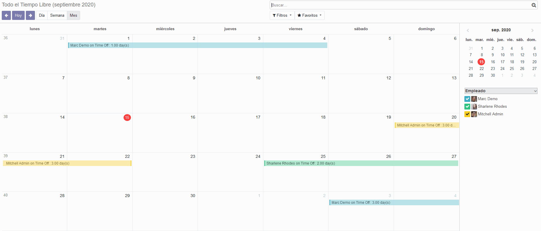 - Desde la sección Todos, podremos ver mediante una vista de calendario todas las ausencias de los trabajadores.