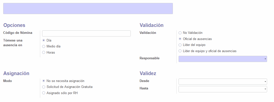 Sin Asignación: el tipo de ausencia será “elegible” por cualquier usuario sin necesidad de que previamente exista ninguna acción por parte de un responsable.