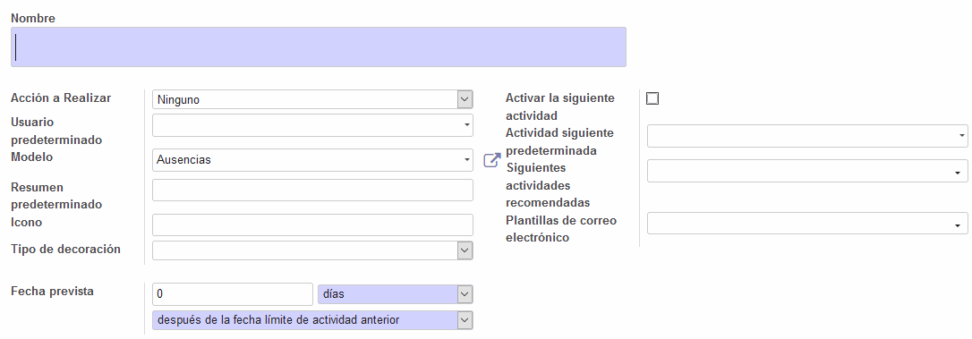 Por defecto, Odoo crea varias actividades vinculadas a los modelos de Ausencias y de Asignación de Ausencias que pueden modificarse según las necesidades o querencias de cada empresa. Evidentemente, también es posible crear nuevos tipos de actividades.