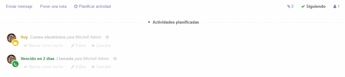 Las actividades son un elemento introducido por Odoo de manera global a toda la aplicación en la versión 12 y permite generar recordatorios que ayudan al usuario a realizar sus tareas diarias.