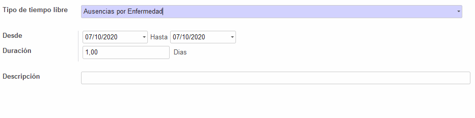 Tras indicar el tipo de ausencia, las fechas desde y hasta (la duración se calcula automáticamente) y un campo de descripción donde detallar, opcionalmente, más información acerca de la ausencia solicitada:
