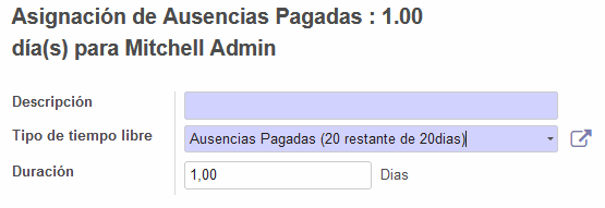En este caso, como podemos ver en la siguiente imagen, crearía una petición de asignación y, si está es aprobada, aumentará los días disponibles de Ausencias Pagadas (de 20 a 21 días, en este ejemplo) pudiendo ser solicitados como ausencia.