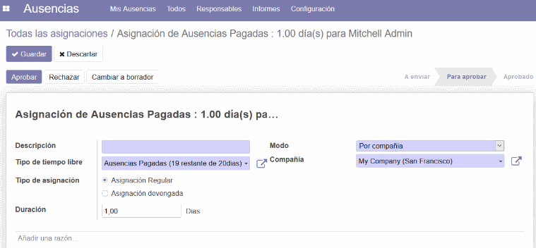 Tendremos que indicar una descripción de la petición, el tipo de asignación que queremos solicitar y su duración. Una vez realizada deberá ser aprobada si el tipo de ausencia así lo establece en su configuración.