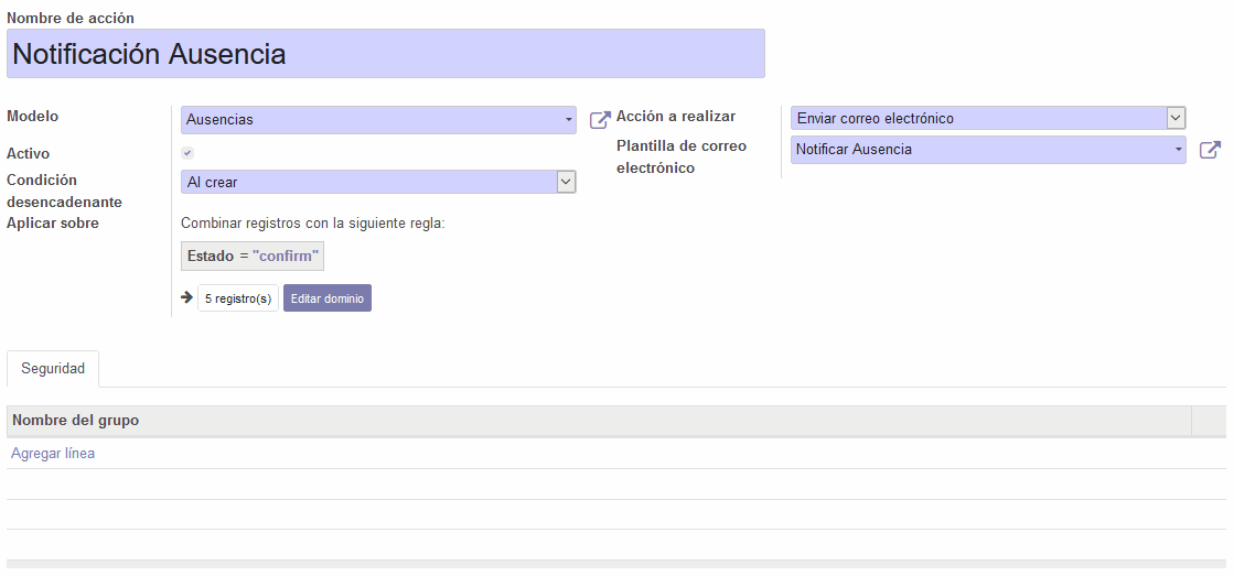 2) En el campo ‘Modelo’ indicaremos el valor “Ausencias”, ya que es el modelo al que queremos aplicar la acción automática.