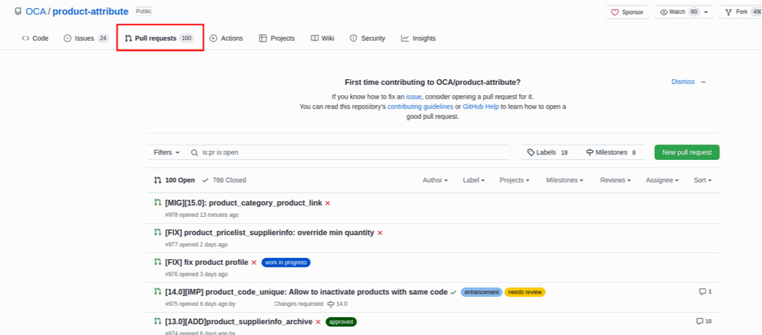 Cuando accedemos a un repositorio podemos observar una pestaña llamada Pull requests, en la cual podremos consultar el listado de los diferentes PR que se han realizado para ese repositorio.