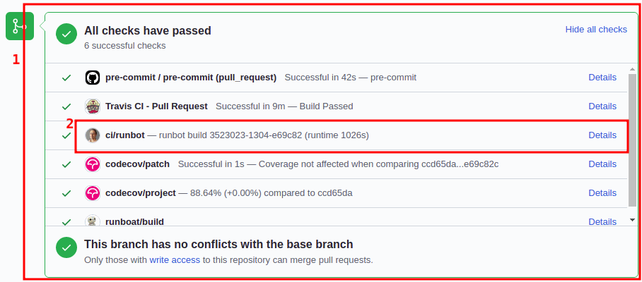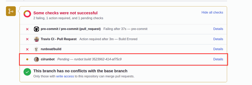 Cuadro 2: Podemos observar el estado en el que se encuentra Runbot para ese PR. Podemos distinguir 3 estados diferentes: