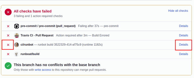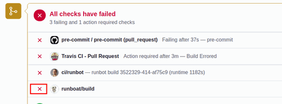 Al igual que Runbot, Runboat puede no estar disponible, no pudiendo ser utilizado para las pruebas. Este estado es identificable, ya que aparecerá el símbolo "X" al comienzo de la línea, tal y como se puede observar en la imagen.
