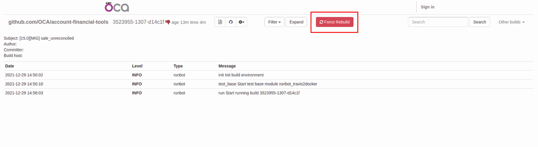 Cabe destacar que siempre habrá pequeñas excepciones. Por ejemplo, que el indicador de Runbot sea el icono en forma de V de color verde, y después de seleccionar la opción Details nos indique que se ha de realizar la reconstrucción (Force rebuild). Este caso, puede ser debido a que el Runbot ha sido cerrado y deberá volver a reconstruirse para su uso.