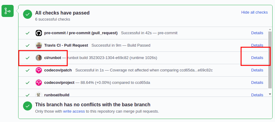 Otro de los posibles estados de Runbot es disponible. Es identificable mediante una "V" de color verde. Esto indica que se puede hacer uso de Runbot para probar el PR. Para ello es necesario seleccionar la opción Details situada a la derecha de la línea.