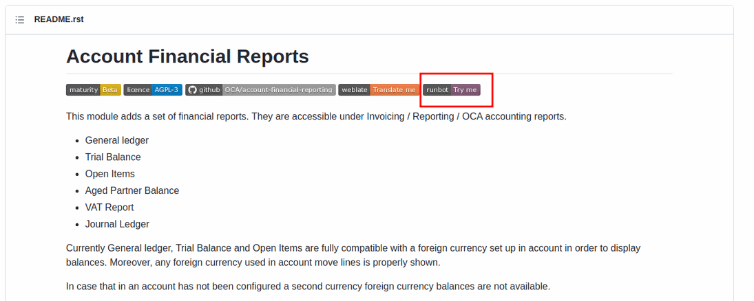 Otra opción que nos ofrecen es la de probar un módulo desarrollado por OCA en un Runbot. Para ello, deberemos seleccionar un repositorio y un módulo que pertenezca a éste. Deberemos dirigirnos a la parte inferior de la pantalla, hasta encontrar una opción llamada "runbot Try me". Al seleccionar esta opción se nos redirigirá al acceso de un Runbot, donde deberemos ingresar el usuario y la contraseña.