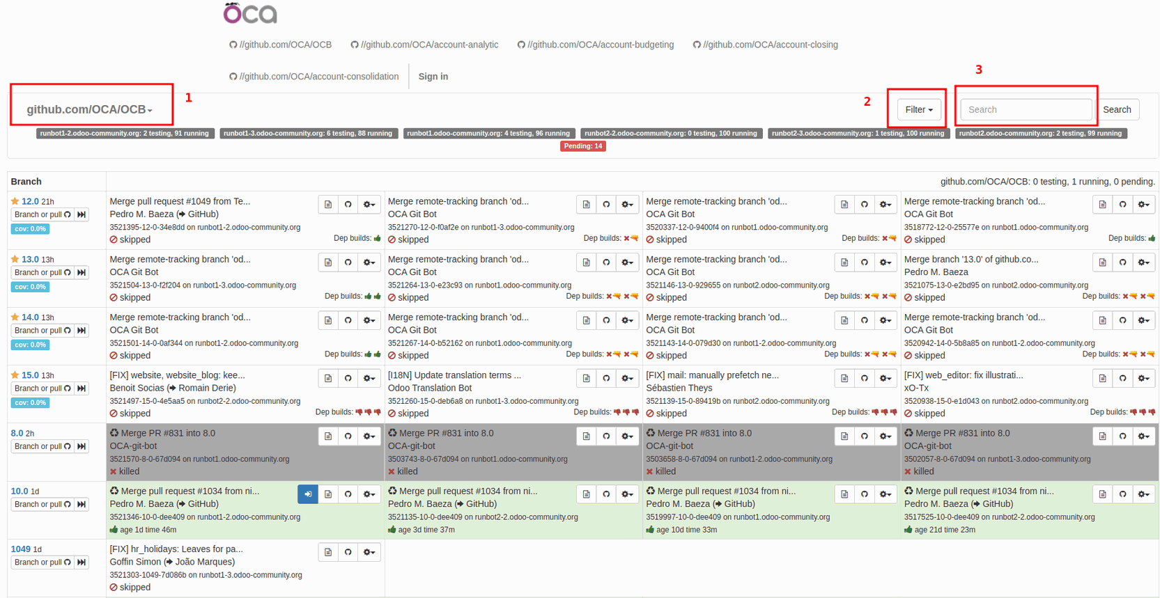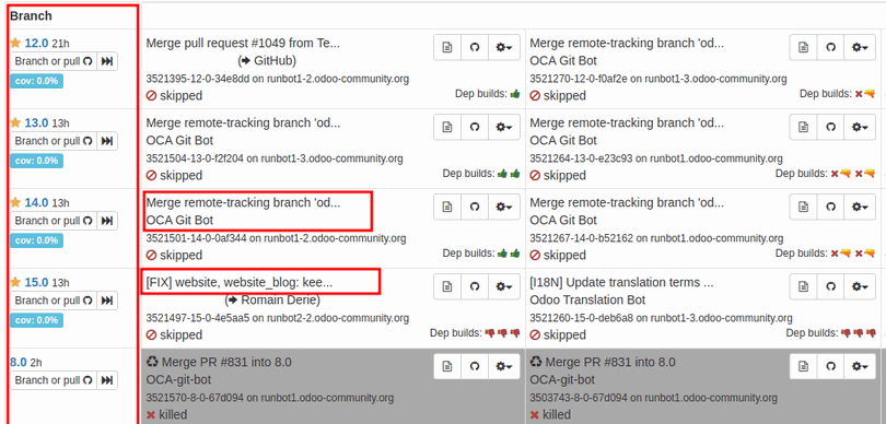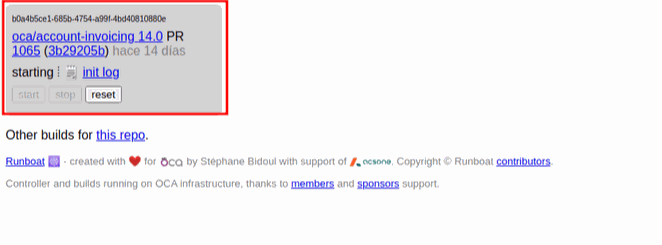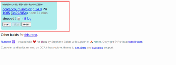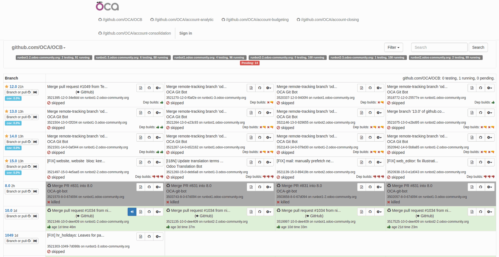 Otra manera de probar los diferentes repositorios y módulos mediante un Runbot de OCA es mediante el siguiente enlace. Éste nos llevará a una pantalla donde podremos observar distinta información. Vamos a analizarla a continuación.