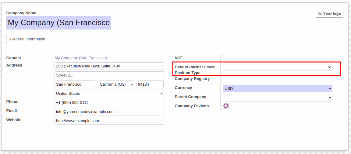El primer cambio se produce dentro de la configuración de nuestra compañía, donde se ha añadido el campo Default Partner Fiscal Position Type, en este campo nos permite establecer un valor referente a la posición fiscal de forma predeterminada a la hora de crear clientes, ofreciendo 3 posibilidades: