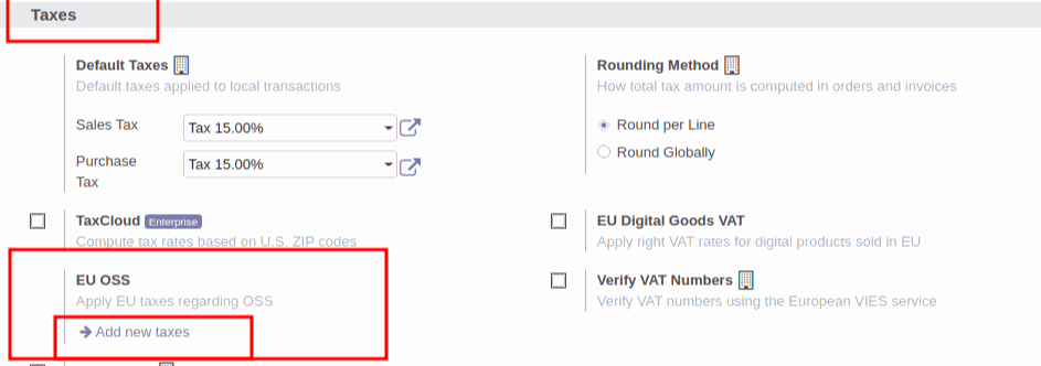 Se trata de un módulo que nos ofrece un asistente para la creación masiva de las posiciones fiscales de la Unión Europea. Este módulo tiene dependencia del módulo anterior, lo que significa que será necesario instalar el anterior para poder hacer uso de este. Para poder utilizar el asistente se ha de acceder al módulo de Facturación. Una vez dentro del módulo debemos seguir la siguiente ruta: Configuración->Ajustes. Ya en la pantalla de ajustes, podremos observar diferentes bloques, en este caso debemos centrarnos en el bloque de Impuestos. En este apartado podremos encontrar una opción llamada Añadir nuevos impuestos tal y como podremos ver en la siguiente imagen.