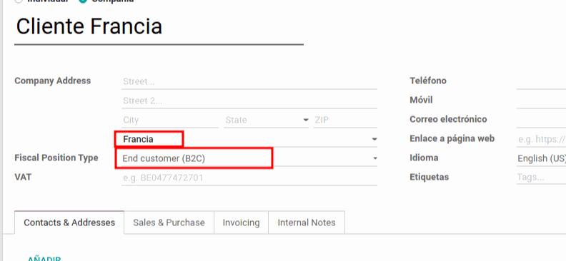 Para el caso de uso que planteamos, necesitamos indicar al sistema que se trata de un cliente francés, por lo que en el campo País deberemos introducir el país indicado. Debemos tener en cuenta que Odoo tiene en cuenta otro campo para identificar la nacionalidad del cliente, se trata de la dirección de envío. Otro campo a recordar es Fiscal Position Partner Type, donde deberemos indicar si se trata de un cliente B2C o B2B, en este caso se seleccionará B2C.
