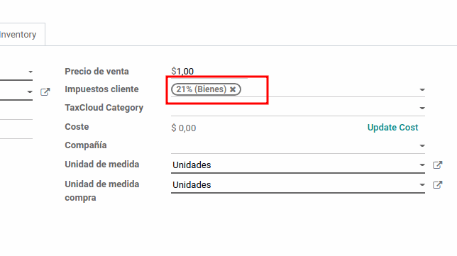 Creación de un producto llamado Impuesto general, dicho producto tendrá un IVA del 21% que es el impuesto general en España.