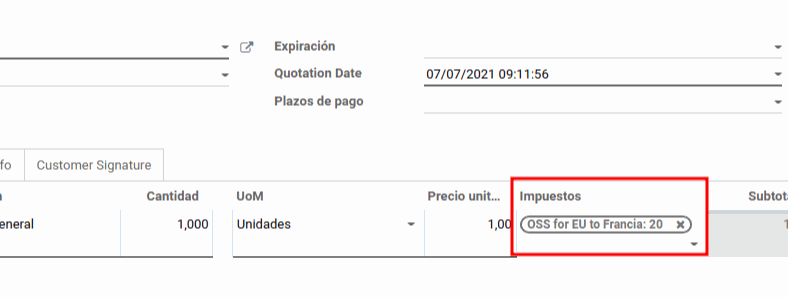 Como se puede observar en la imagen, el impuesto aplicado es OSS for EU to Francia: 20, que es el correcto ya que realizamos la venta en Francia. Recordemos que este impuesto ha sido creado gracias al asistente facilitado por el módulo l10n_eu_oss explicado en el apartado 2.2.