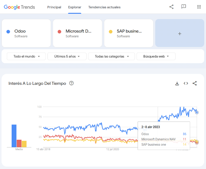 Si comparamos en Google Trends Odoo con algunos de sus competidores podemos comprobar fácilmente que la tendencia de Odoo es mayor y crece cada año. Sin embargo sus competidores están estancados o bajando.